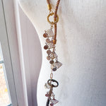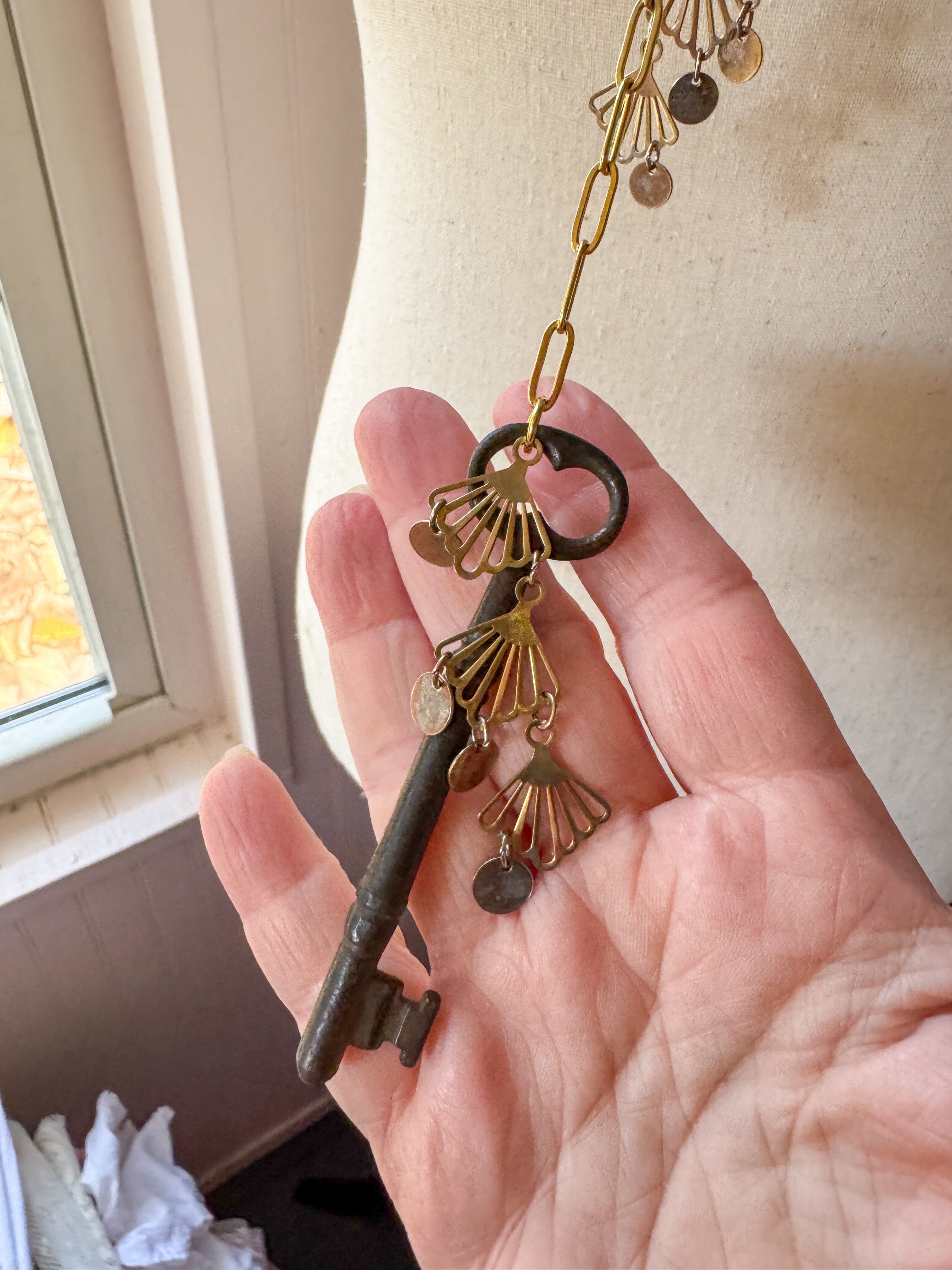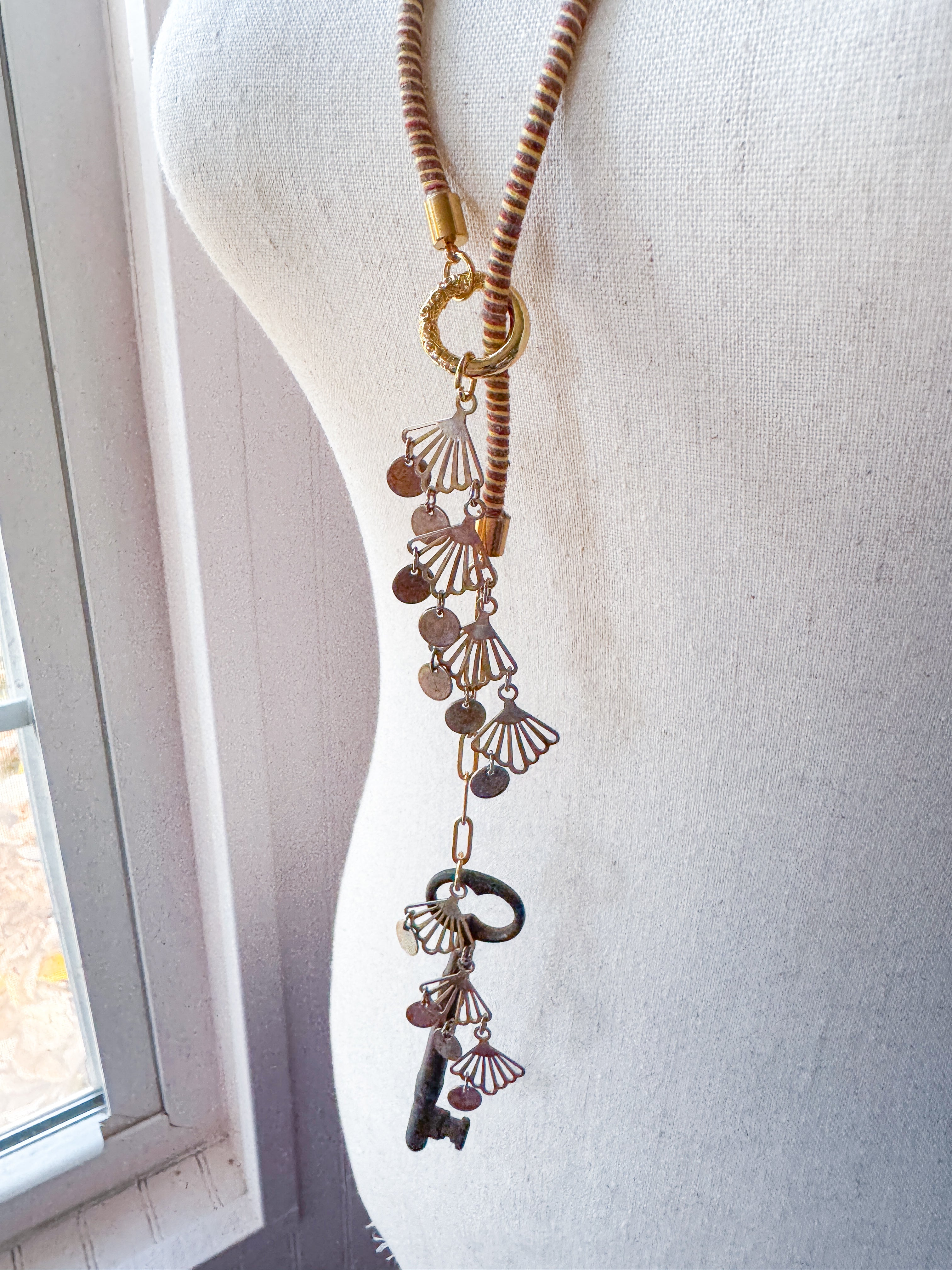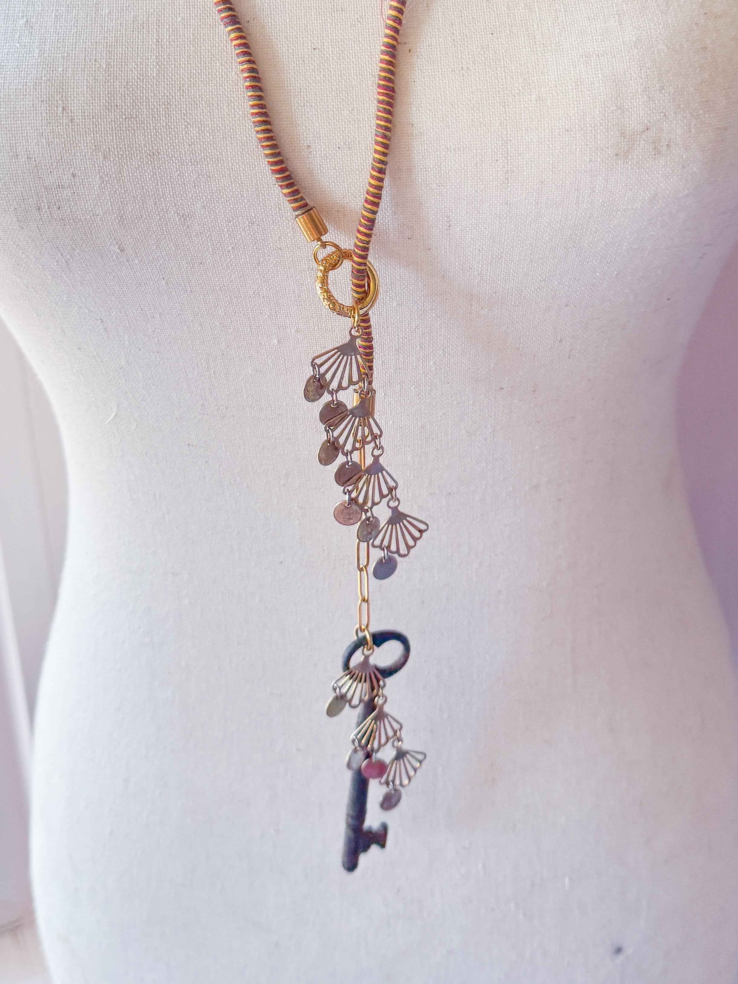Repurposed vintage ingredients : vintage skeleton key, mid 1900’s charms, cotton cording and 18kt gf paperclip chain. The necklace is adjustable by sliding the chain through the ring. Key dangles 3”s and end to end the cording is 30”s.