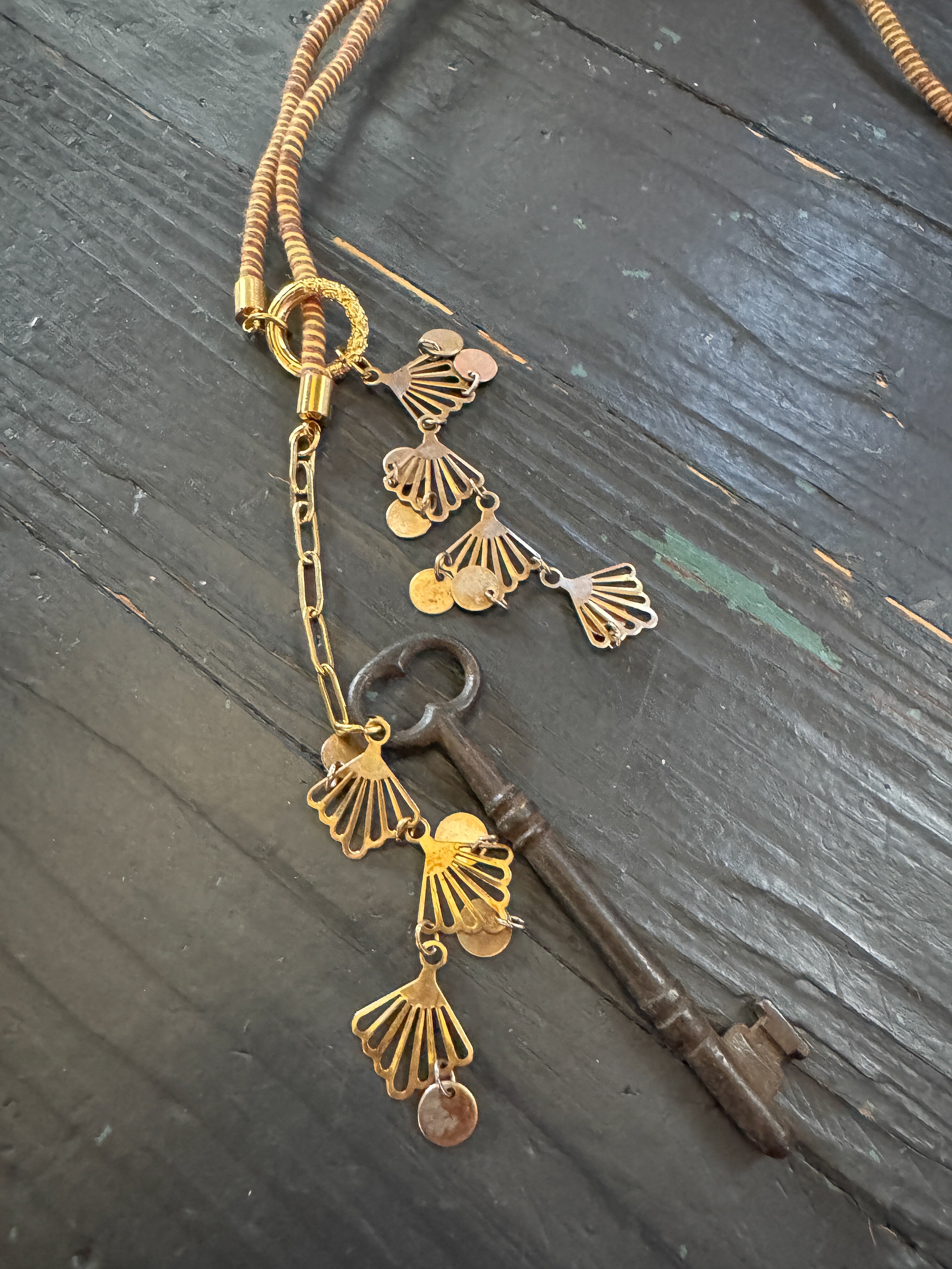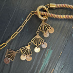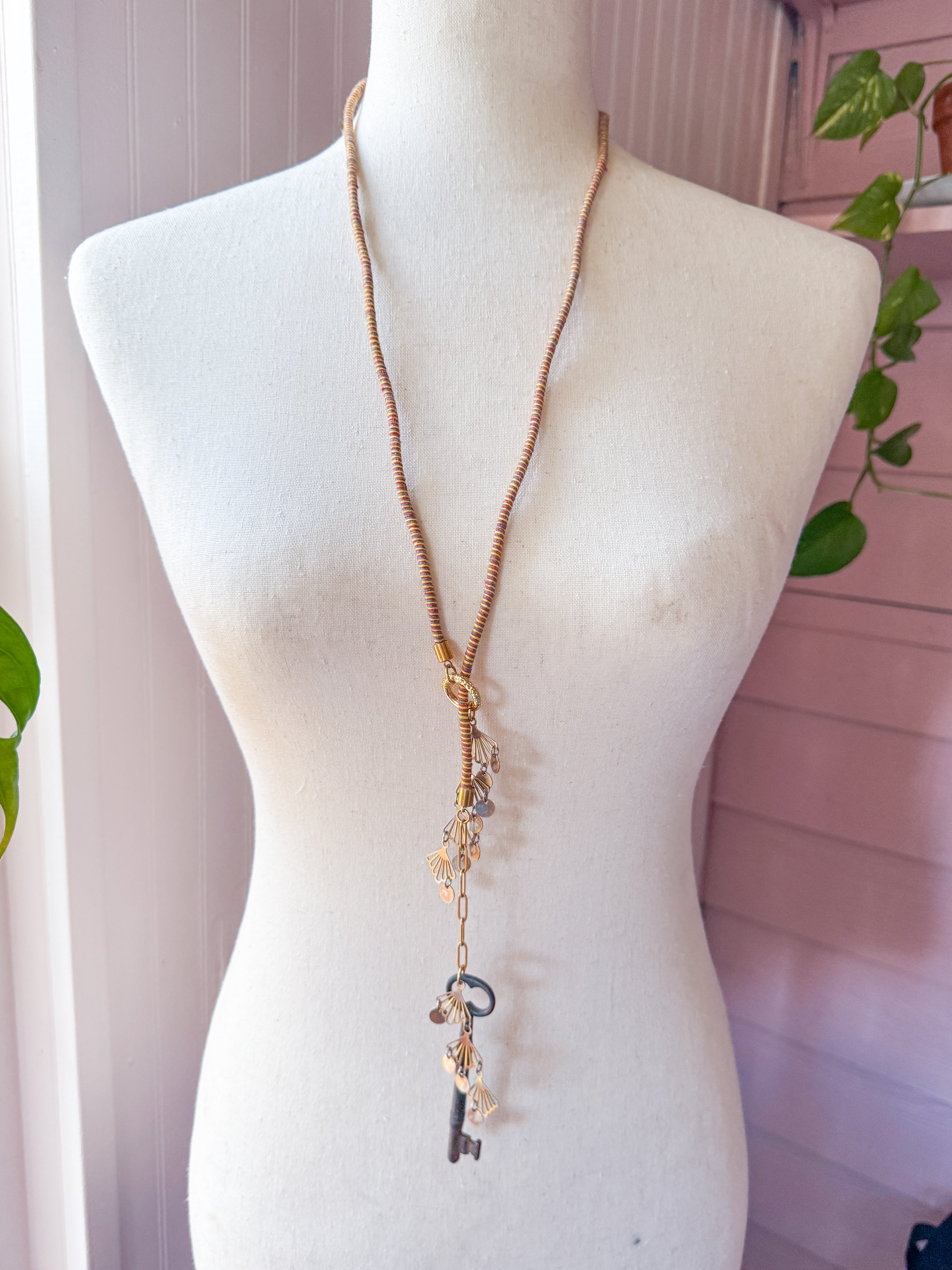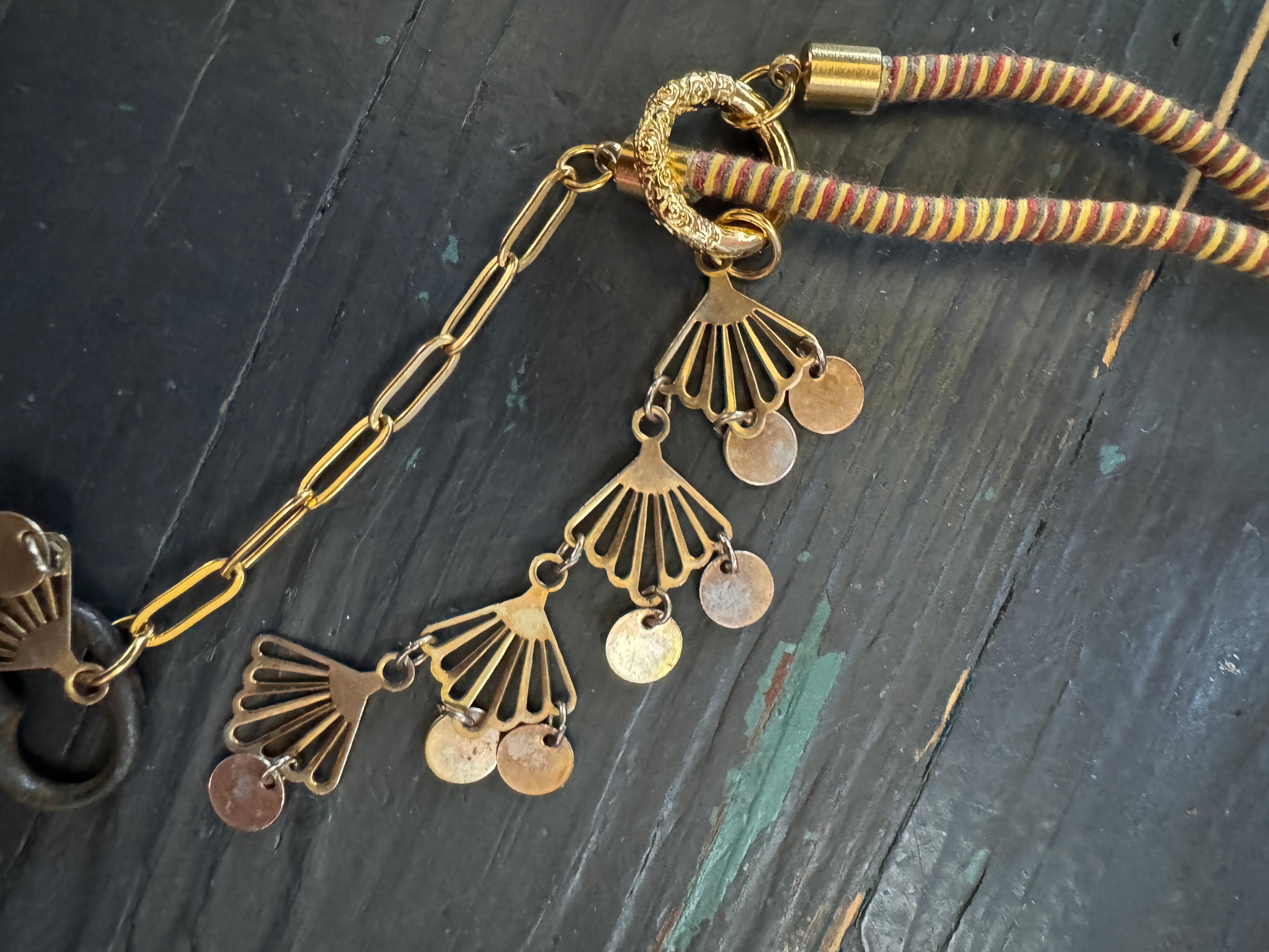 Repurposed vintage ingredients : vintage skeleton key, mid 1900’s charms, cotton cording and 18kt gf paperclip chain. The necklace is adjustable by sliding the chain through the ring. Key dangles 3”s and end to end the cording is 30”s.